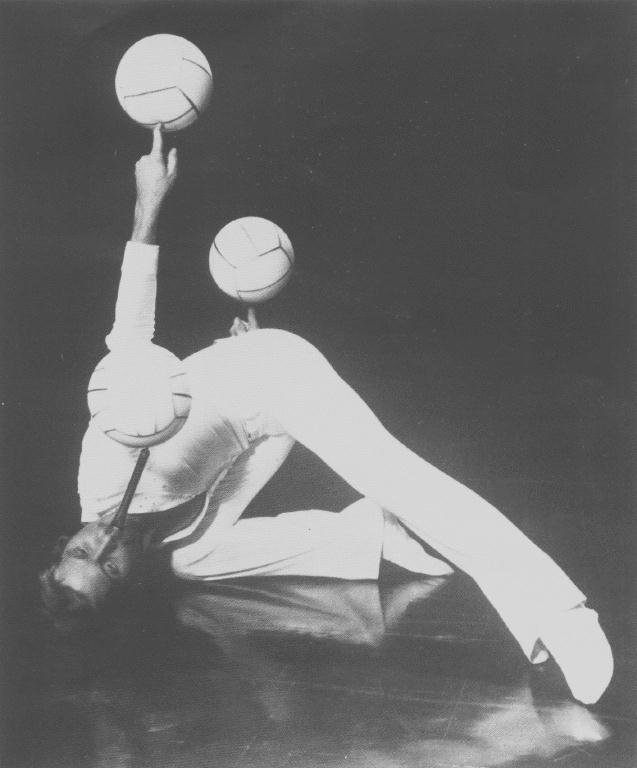 He combines ball tricks with mouthstick manipulations in many creative and difficult ways. He does a slow backward roll-over while spinning a ball on both forefingers and a third on the tip of a mouth stick. He holds a single ball between his heels and a mouthstick in his mouth, does a back handspring to toss the ball up in the air and catches it on the stick.