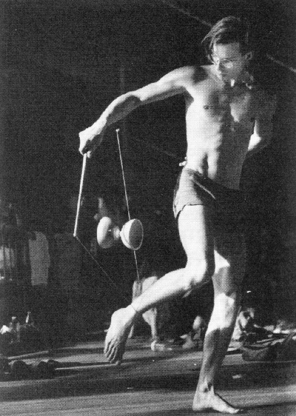 A pinball addict at age 15 who quit school at age 18 to juggle full-time, he speaks five European languages. He's recently joined with a fledgling circus, Parody Paradise, in Germany to present small ensemble circus-theatre around Europe. "I want to be free, perform, then do nothing the rest of the day," is a quote that captures his gypsy attitude. Some would call him debauched, and he has a jail record to support suspicions of a lifestyle on the fringe of proper society.