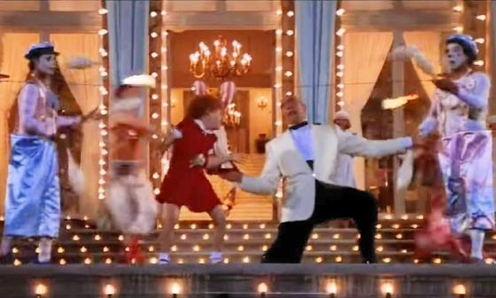 At 0:08:20, during "It's the Hard Knock Life," a girl in the orphanage juggles three cans for less than a second before falling off her bed.
