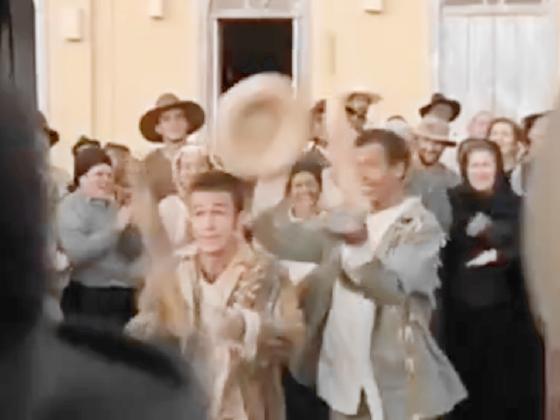 At 1:04:01, at an outdoor fair, 2 jugglers perform continuous steals with 3 clubs and a hat.