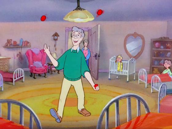 At 01:00, as the movie begins, even before the opening titles, Mr. Cherrywood juggles 3 balls for the children at bedtime.