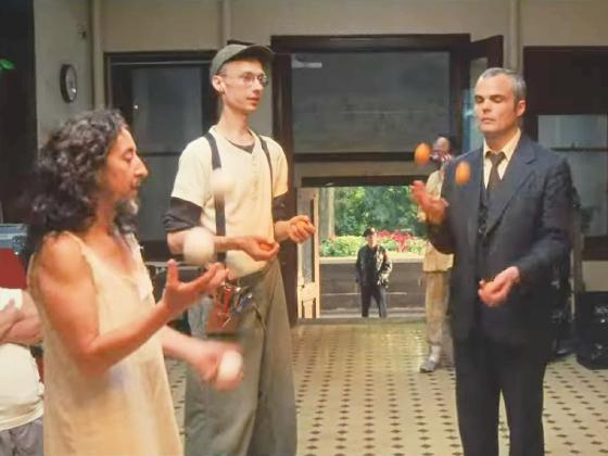 At 26:46, Stephen Plunkett, playing Max, and Jennifer Miller, the bearded lady, playing Clementine, each juggle 3 balls together. A third person then joins them.