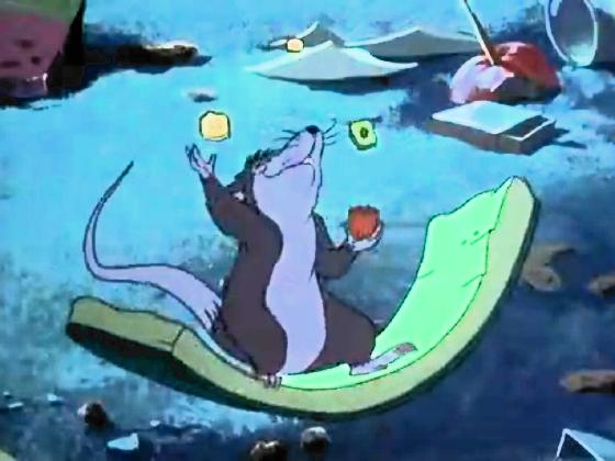 At 1:11:34, during a musical scene, a rat is eating everything in sight