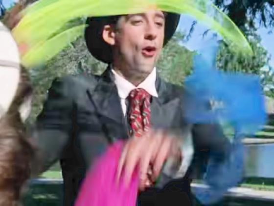 At 1:30:50, Michael Aaron Santos juggles in a park for a small crowd, starting with 3 balls, which he finishes by catching one n his hat. He next juggles 3 scarves and then passes his hat for tips.