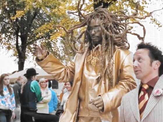 At 40:17, during an outdoor fair, a street performer is seen in the