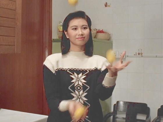 At 56:50, Jackie Chan and Pauline Yeung are cooking in the kitchen. Jackie does some tricks with a knife and a wooden masher. Pauline does better by juggling 3 lemons, until he throws an onion at her, messing up her pattern. He then teases her because he made her look foolish.