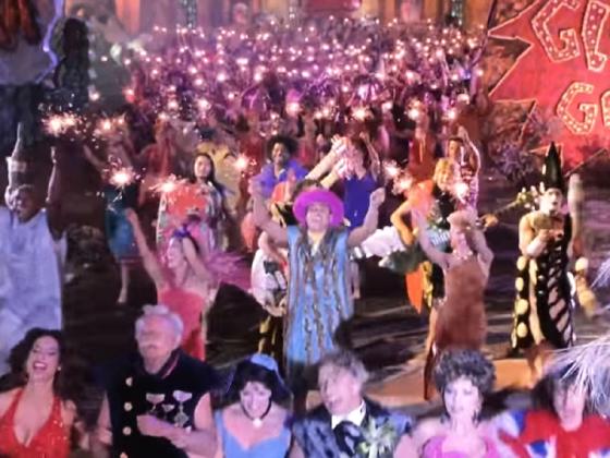 At 1:23:35, during the Flintstones theme song production number at the climax of the movie as it ends, Max Daniels is dressed as a clown and juggles 3 clubs as he marches forward on the right side of the screen.