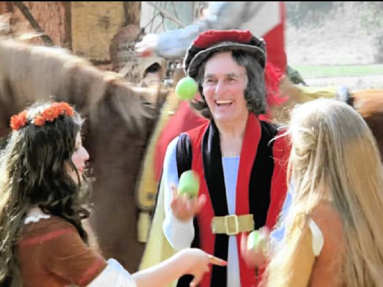 At 32:29, a jester juggles 3 green apples in a medieval scene for