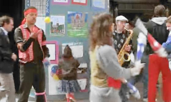 At 23:10, a man juggles 3 balls as a girl walks across the screen in