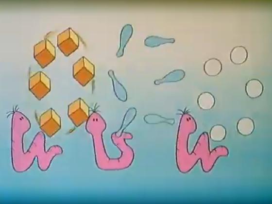 At 13:37, in a circus scene, a worm juggles 4 balls with his tail, and then 3 worms juggle 6 objects each side by side, using cubes, clubs, and balls.