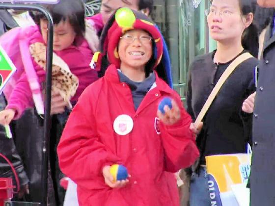 At 01:01, a Salvation Army worker on the street is very happy to be juggling 3 balls for 1 second.