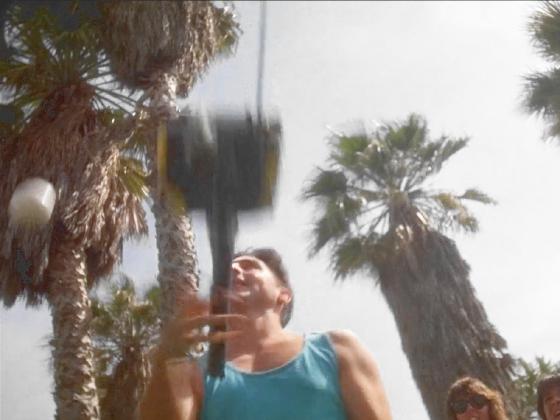 Venice Beach at night, we see Robert Lind in the background juggling 3