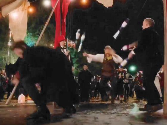 At 0:52:20, someone juggling 3 clubs can barely be seen among a crowd