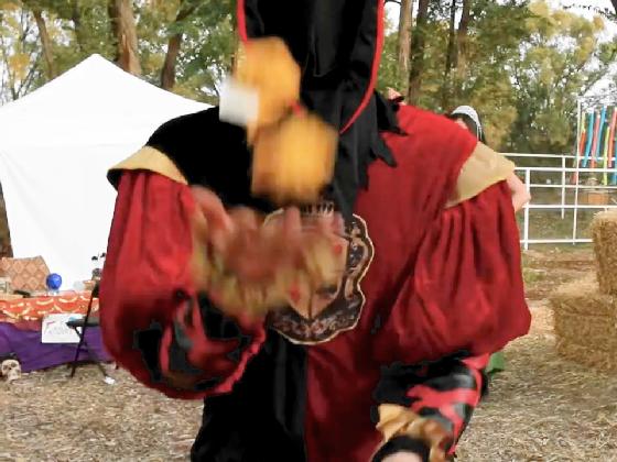 At 00:56, Jesse Fisher, playing the Juggling Jester, juggles 3 balls in the background for 20 seconds, including a few tricks.