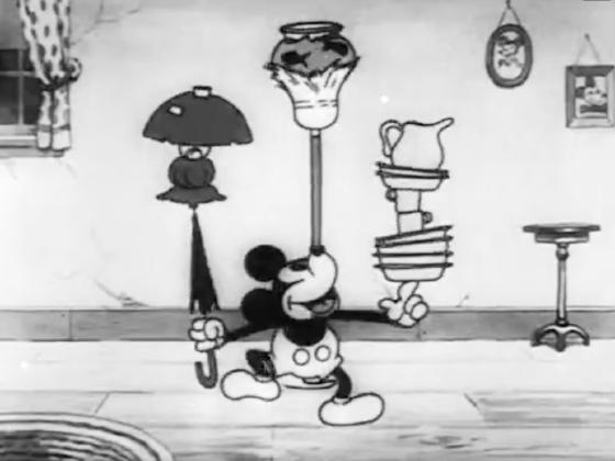 At 05:29, Mickey Mouse balances a broom on his nose with a fishbowl