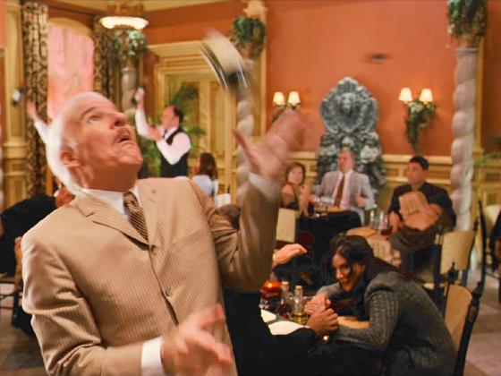 At 13:42, playing Inspector Clouseau, Steve Martin bribes the Maître d' of an expensive restaurant so that he could select his own wine from a large wine rack. He chooses 3 bottles but one nearly falls, and when he recovers it, he bumps the rack, which starts to tilt, dropping bottles one at a time. Martin catches each of the bottles, tossing them out to waiters and other customers, and soon bottles are flying through the air being "juggled" by many people. This soon leads to the entire restaurant burning down.
