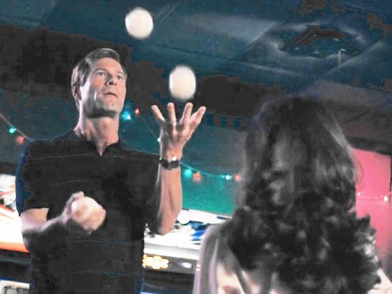 At 54:29, Aaron Eckhart, playing Howie Corbett, juggles 3 balls from a Skee-Ball game at a bowling alley for 4 seconds.