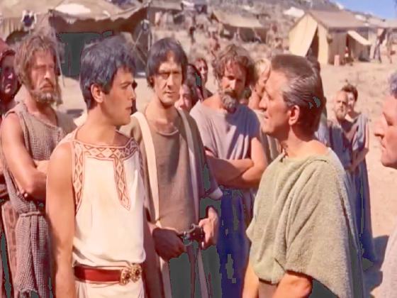 The slave Spartacus survives brutal training as a gladiator and leads a violent revolt against the decadent Roman Republic, as the ambitious Crassus seeks to gain power by crushing the uprising. At 1:23:14, Spartacus (Kirk Douglas) meets Antoninus (Tony Curtis) and had this exchange: