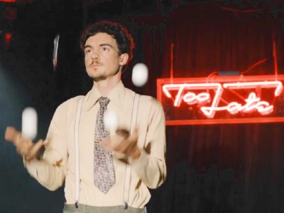 At 19:50, creative German juggler Toni Bauhofer performs on stage at a comedy club juggling 3 balls and a pen for 23 seconds.